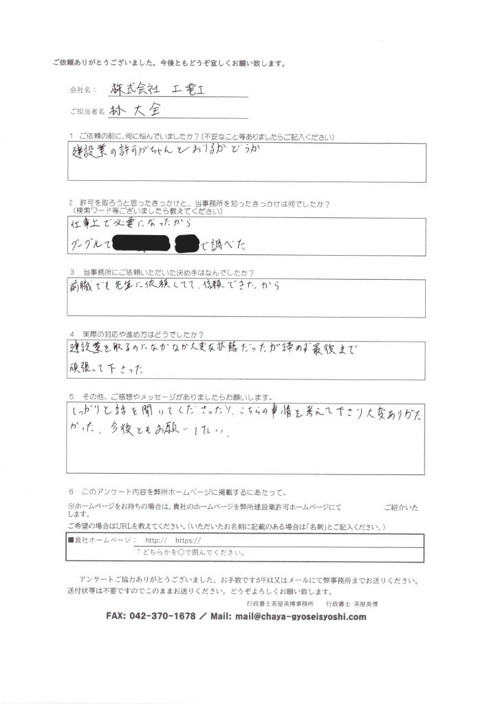 当事務所は建設業許可に特化した行政書士事務所です。他事務所で断られた困難な許可もスムーズに対応いたします。
